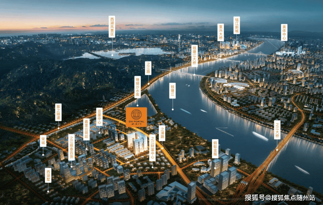 之江门商墅的稀缺,始于“一线临江”的不可复制性。项目坐落于西湖区之江板块核心,东临钱塘江支流,与宋城景区隔江相望,南接蚂蚁金服总部基地,北靠浙大一院之江院区(约1.5公里),西连之江银泰、西投银泰等商业中心,形成“江景+产业+商业+医疗”的全维度生活圈。