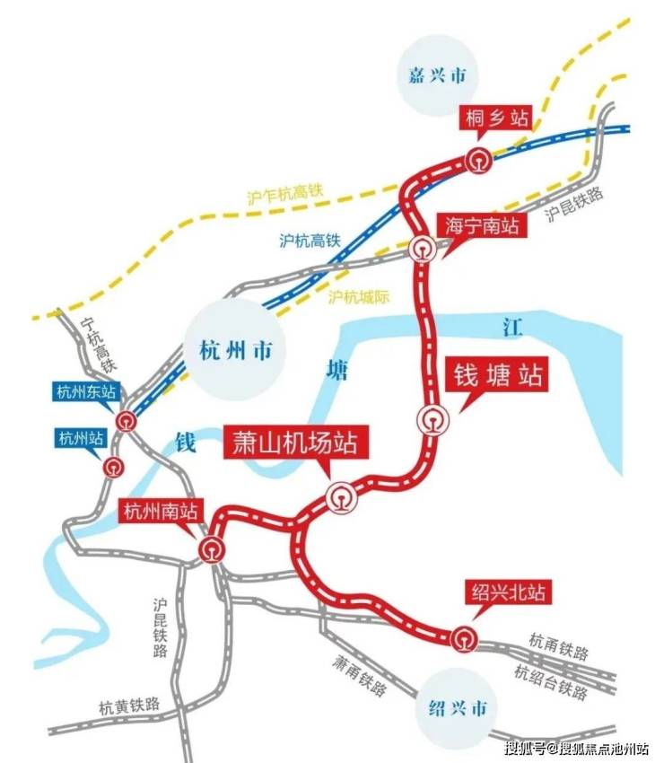 高铁钱塘站:2021年10月,铁路杭州萧山机场站枢纽及接线工程(简称“杭州机场高铁”)先行工程初步设计获省发改委批复,项目全长约85km,纵贯串联起浙北与浙中,全线新设钱塘站、萧山机场站、海宁观潮站,改扩建桐乡站,投资总额约382亿元。钱塘站位于钱塘区新湾街道河景路和义蓬东二路交叉口的钱塘站。它是机场高铁始发站,有5座站台和11条铁路轨道线,未来还预留接入规划中的市域铁路水乡旅游线。