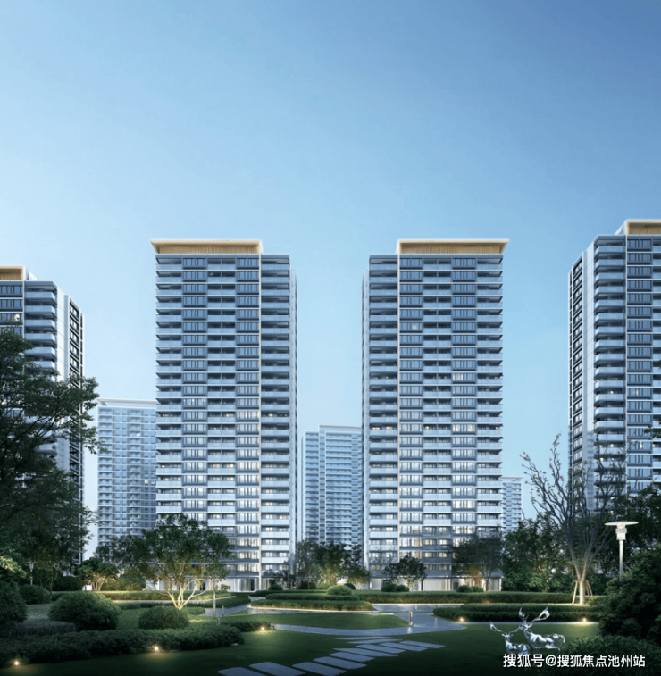 大围合式的建筑布局,谦逊地退位于自然,超70m楼间距 , 为自然留下更多的可能性;近万方的中心庭院,茂盛生长;湖畔度假花园,森林花园,童趣乐园,禅林闲庭等,一个个花园串联起整座园区的生活日常。四面大面积铝板建筑外立面,顶部点缀金色“皇冠”造型,打造湖区美学封面。