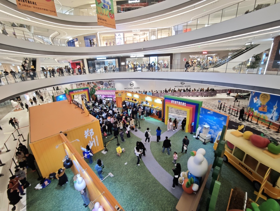 10月19日,郑东万象城“STAYREAL PARK”快闪活动现场人潮涌动,入口处堆满了行李箱。“我们专程从深圳飞来看演出,又赶来这里买周边,已经排了两小时队。”一位歌迷兴奋地说。