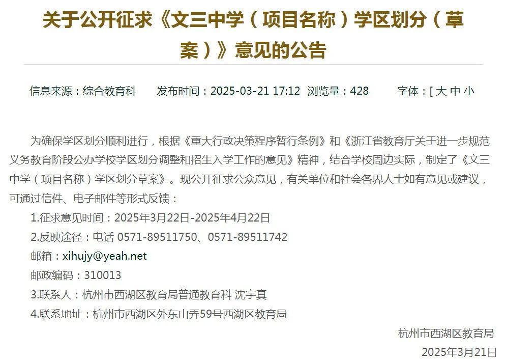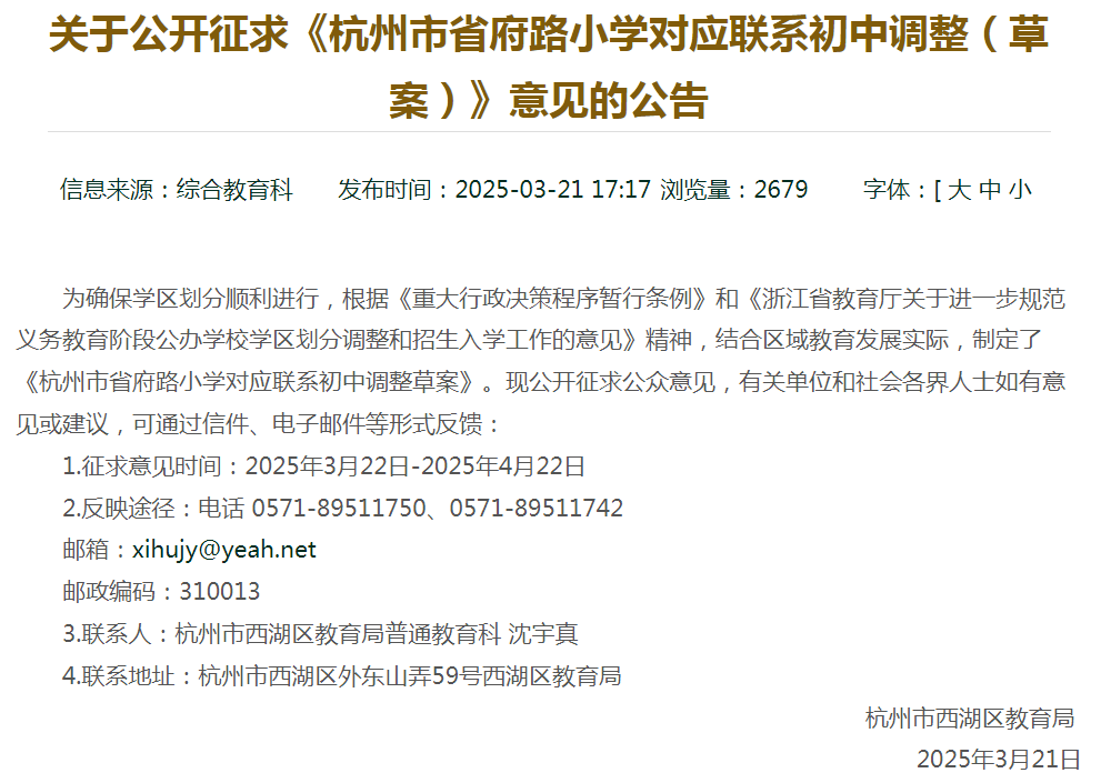 2.省府路小学已与育才实验学校(育新小学)组成了新的管理单元,学区范围也有关联。因此,从该板块教育整体布局考虑,将杭州市省府路小学对应联系初中调整为杭州市西溪中学,有利于小学和初中的衔接。