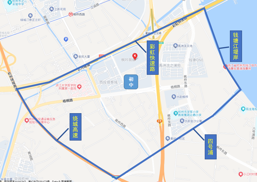2.杭州绕城高速、彩虹快速路、钱塘江、四号浦形成的合围比较规整,边界清晰,几个住宅小区到钱塘风雅中学(项目名称)的距离较近,符合就近入学的规范要求。