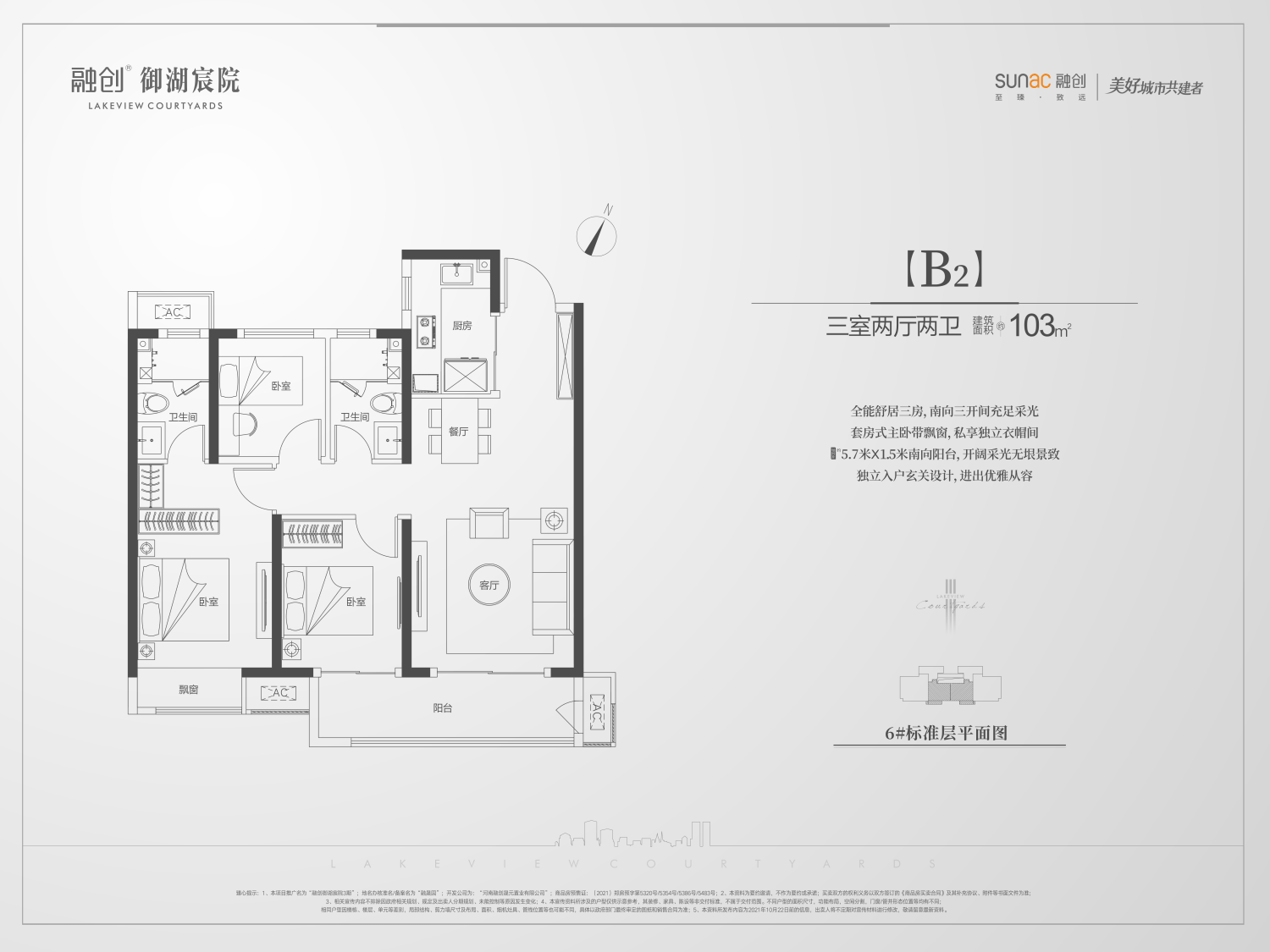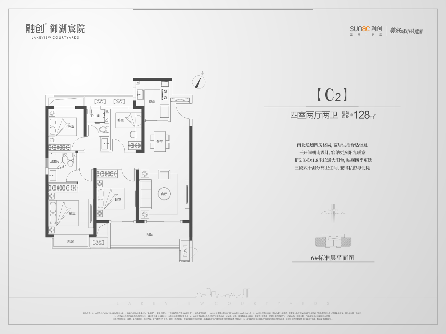 :南北通透,三开间朝南,5.8 米 ×1.8 米拉通大阳台,三段式干湿分离卫生间,满足二孩家庭改善需求;